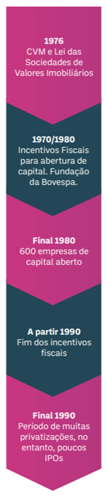 Historicamente, os mercados financeiros brasileiros sempre foram fortemente regulados (Gorga, 2006) e, em 1976, foi criada a Comissão de Valores Mobiliários (CVM) e aprovada uma nova Lei das Sociedades de Valores Mobiliários, que incluía regras que regem empresas públicas e bolsas de valores.