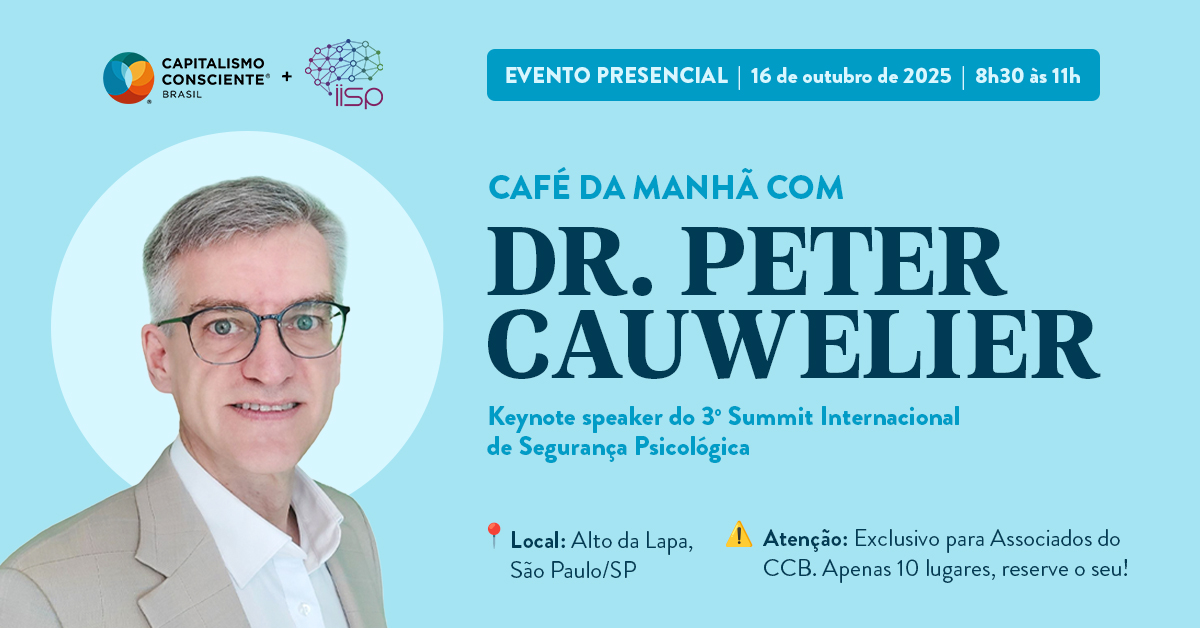 No dia 16 de outubro, das 8h30 às 11h, o Capitalismo Consciente Brasil (CCB), em correalização com o Instituto Internacional de Segurança Psicológica (IISP), promoverá um encontro único e presencial em São Paulo com o Dr. Peter Cauwelier, Keynote Speaker do 3º Summit Internacional de Segurança Psicológica e referência mundial em segurança psicológica e performance de times. O evento é exclusivo para colaboradores de empresas associadas ao CCB.